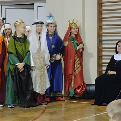 Z tej okazji w naszej szkole, jak co roku, odbyły się Jasełka. Inscenizacja odegrana została przez uczniów klas IV i V b. Przygotowania i próby odbywały się pod czujnym okiem s. Anny, która włożyła wiele troski i serca w to, by aktorzy jak najpiękniej przekazali przesłanie płynące z faktu Bożego Narodzenia. Uroczystość uświetniał piękny śpiew chórku.