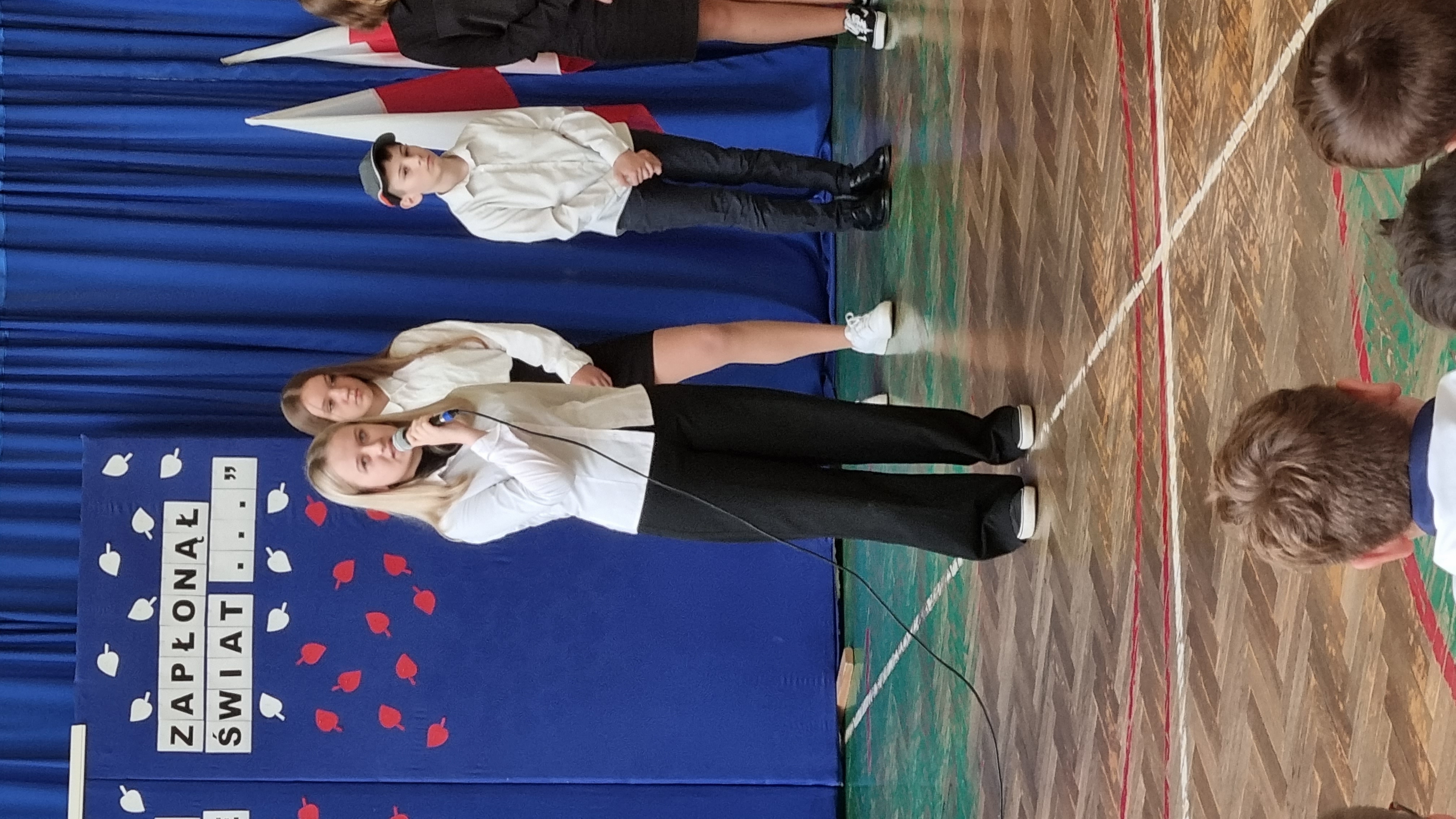 Z tej okazji uczniowie klasy ósmej przygotowali część artystyczną, którą zaprezentowali na uroczystym apelu.
