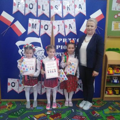 Uczestniczyliśmy w Przeglądzie Pieśni Patriotycznych. Dzieci za występ otrzymały pamiątkowe dyplomy i upominki. Podczas przeglądu przedszkolaki miały okazję poznać niezwykłego gościa – niedźwiedzia Wojtka, z którym wykonano pamiątkowe zdjęcia.