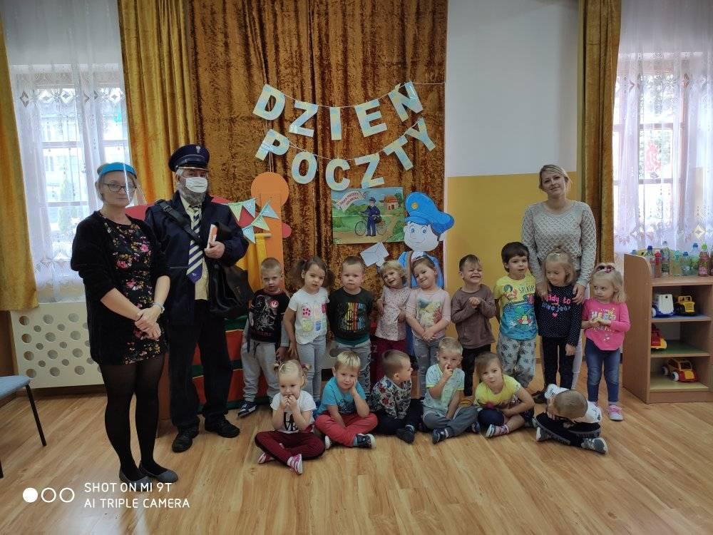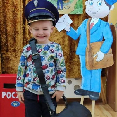 - W piątek 9 października obchodziliśmy Dzień Poczty Polskiej i Dzień Listonosza. Zajęcia były również częścią innowacji o zawodach. Gościliśmy u siebie przemiłego gościa – Pana Pawła – listonosza, który przybliżył nam wiadomości o swojej pracy. Omówiliśmy sobie różne rodzaje kartek pocztowych, listów, drogę, jaką musi przebyć list od nadawcy do odbiorcy, sprawdziliśmy, czy ktoś z przedszkolaków zna swój adres, oglądaliśmy przepiękne znaczki pocztowe, dzieci poznały atrybuty listonosza (strój, czapka i torba). Największą jednak atrakcją było przymierzenie czapki i torby i wykonanie pamiątkowego zdjęcia. Na koniec wizyty wręczyliśmy naszemu gościowi dyplom, dziękując za wizytę. A po drugim śniadaniu projektowaliśmy własne znaczki pocztowe, używając do tego pieczątek z ziemniaków.